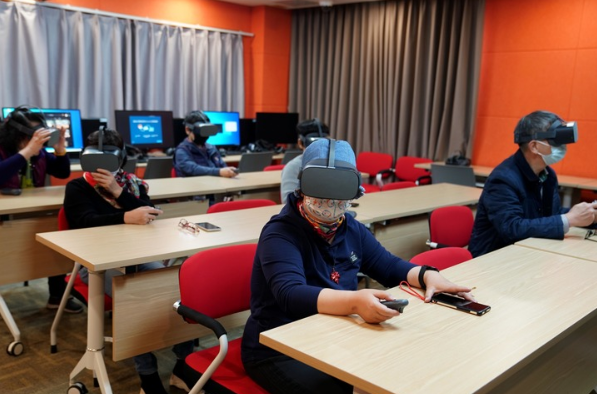 2021年11月26日,在上海老年大學(xué)欽州書院“科技島”教室,學(xué)員通過VR虛擬體驗(yàn)“環(huán)球旅行”。新華社記者 劉穎 攝