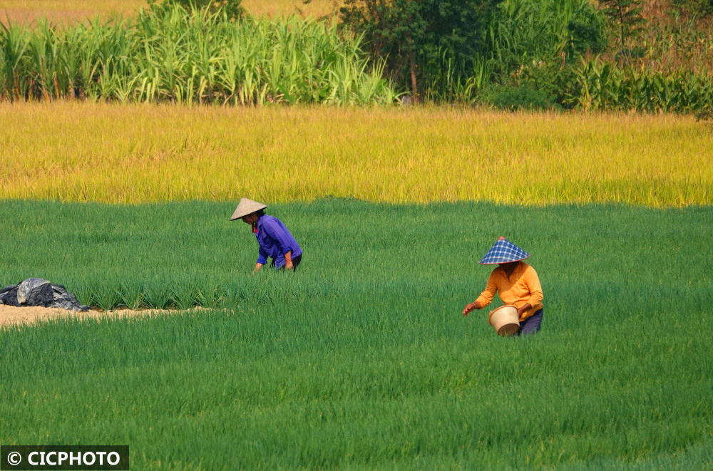 ↑2022年11月7日,廣西南寧市西鄉(xiāng)塘區(qū)石埠街道和安村,農(nóng)民在田間管護(hù)香蔥。CICPHOTO/喻湘泉 攝