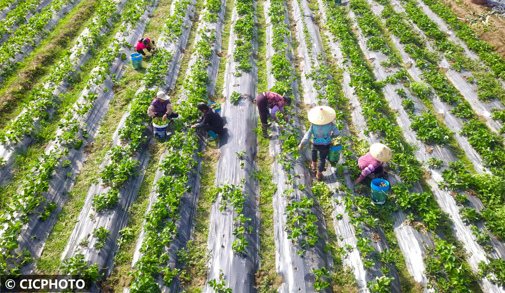 ↑2022年11月7日,廣西賀州市八步區(qū)蓮塘鎮(zhèn),農(nóng)民在田間管護(hù)草莓苗。(無(wú)人機(jī)照片)CICPHOTO/廖祖平 攝