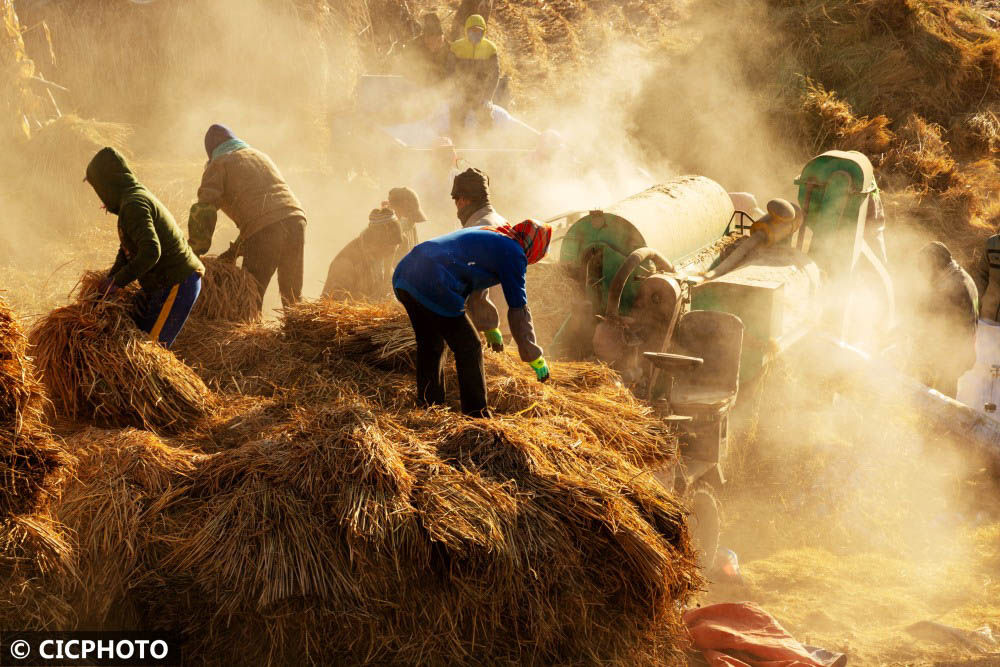 ↑2022年11月5日,吉林省磐石市大泉眼村,農(nóng)民在稻谷場(chǎng)打稻谷。CICPHOTO/徐東林 攝