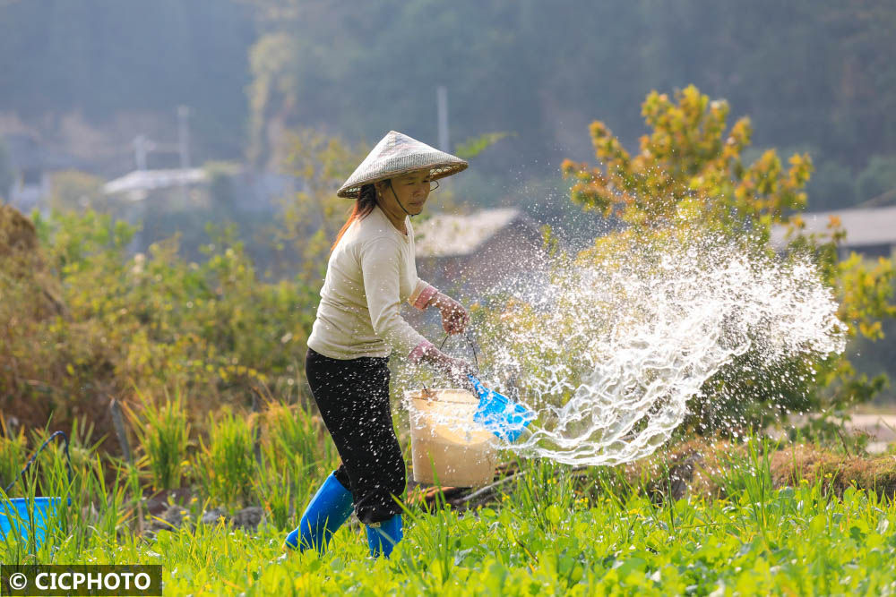 ↑2022年11月5日,貴州省從江縣剛邊壯族鄉(xiāng)三聯(lián)村,農(nóng)民在田間給蔬菜澆水。CICPHOTO/羅京來(lái) 攝