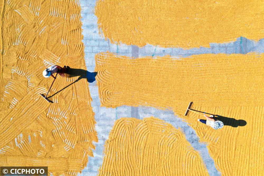 ↑2022年11月2日,廣西南寧市賓陽(yáng)縣古辣鎮(zhèn)蔡村,農(nóng)民在晾曬稻谷。(無(wú)人機(jī)照片)CICPHOTO/喻湘泉 攝