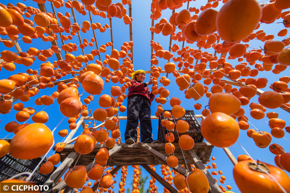 ↑2022年11月2日,山東省臨朐縣五井鎮(zhèn)隱士村,農(nóng)民在吊掛晾曬柿子。CICPHOTO/陳明 攝