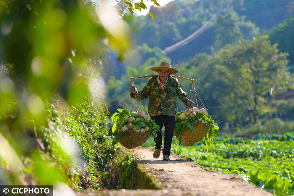 ↑2022年11月2日,重慶市北碚區(qū)龍鳳橋街道鳳凰村,農(nóng)民在擔(dān)運(yùn)剛采收的蘿卜。CICPHOTO/秦廷富 攝
