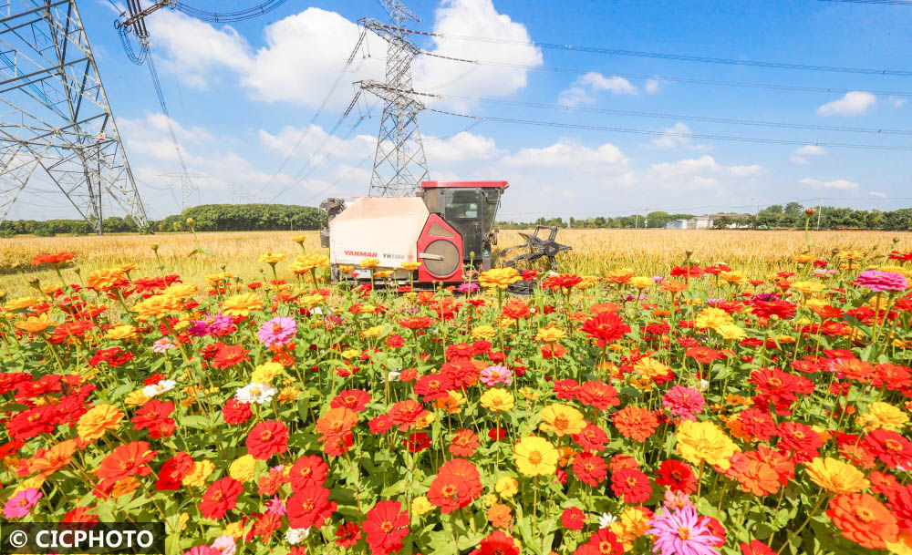 ↑2022年11月1日,浙江省湖州市德清縣新市鎮(zhèn)谷門村,農(nóng)民在駕駛收割機(jī)收割水稻。CICPHOTO/王樹成 攝