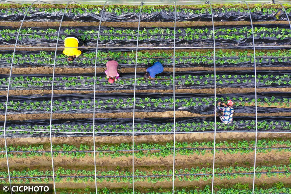 ↑2022年10月31日,湖南省湘西土家族苗族自治州吉首市石家沖街道寨陽(yáng)村,農(nóng)民在管護(hù)草莓苗。(無(wú)人機(jī)照片)CICPHOTO/劉振軍 攝