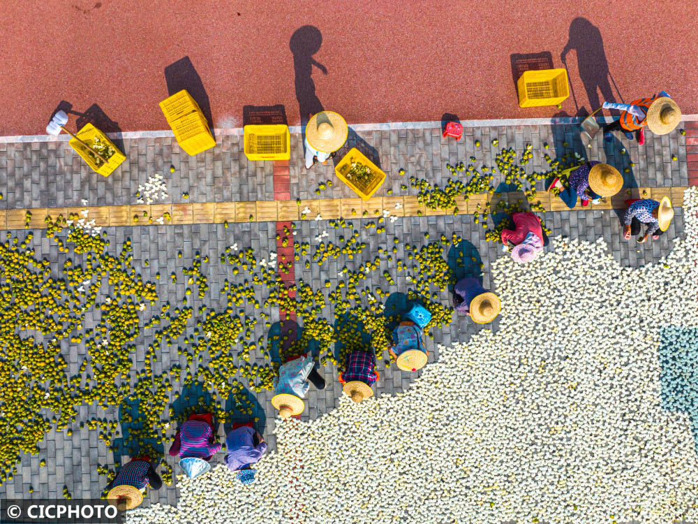 ↑2022年10月29日,山西省運(yùn)城市新絳縣澤掌鎮(zhèn)王金村,農(nóng)民在挑揀晾曬的中藥材旱半夏。(無(wú)人機(jī)照片)CICPHOTO/高新生 攝