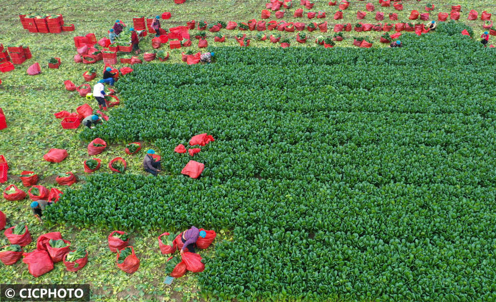 ↑2022年10月28日,安徽省蒙城縣小辛集鄉(xiāng)李大塘村,農(nóng)民在采收青梗菜。(無(wú)人機(jī)照片)CICPHOTO/胡衛(wèi)國(guó) 攝