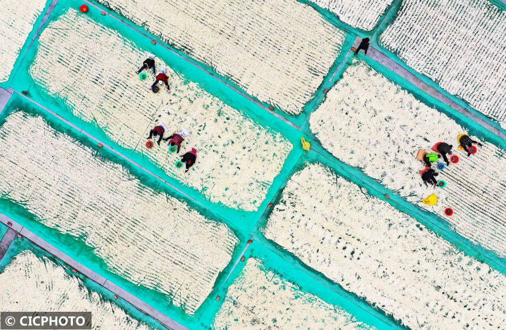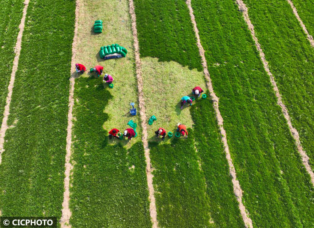 ↑2022年10月28日,山東省聊城市東昌府區(qū)閆寺街道李找村,農(nóng)民在收獲面條菜。(無(wú)人機(jī)照片)CICPHOTO/張振祥 攝