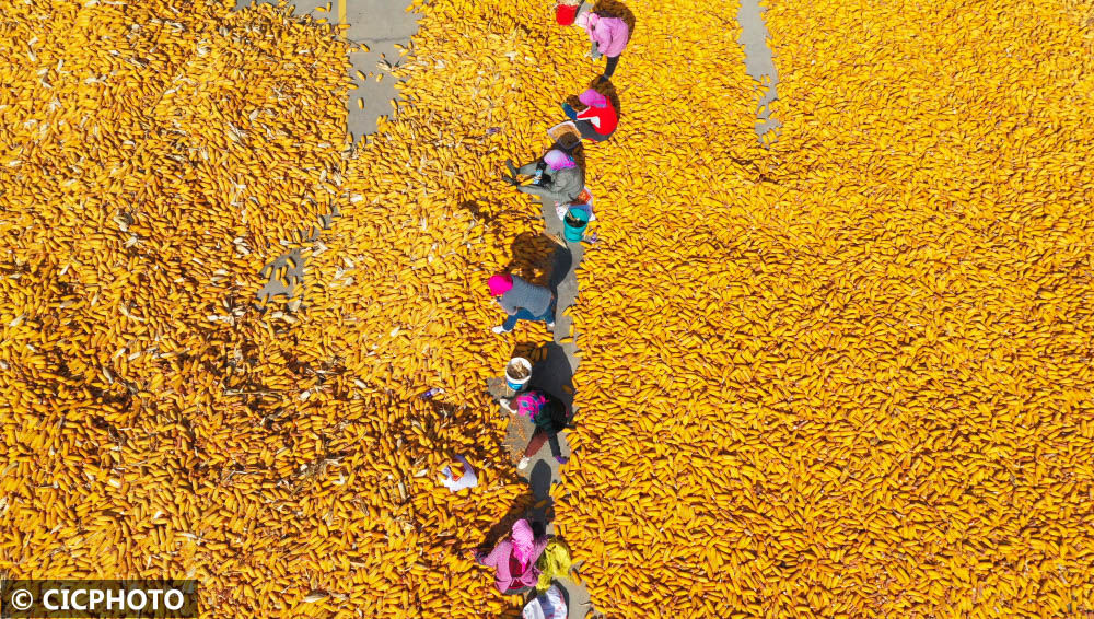 ↑2022年10月27日,遼寧省大連市普蘭店區(qū)沙包街道奎興社區(qū),農(nóng)民在優(yōu)選豐收的玉米。(無(wú)人機(jī)照片)CICPHOTO/呂文正 攝