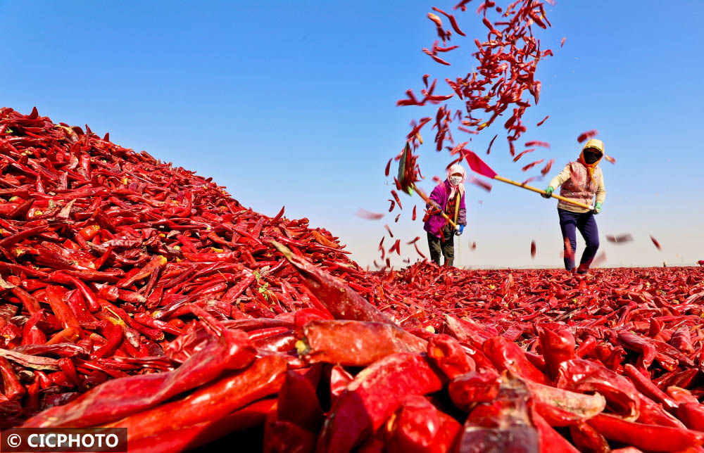↑2022年10月26日,甘肅省張掖市甘州區(qū)烏江鎮(zhèn)敬業(yè)村,農(nóng)民在晾曬紅辣椒。CICPHOTO/王將 攝