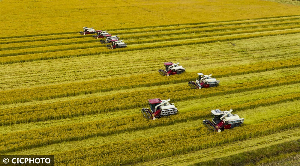 ↑2022年10月26日,江蘇省連云港市東??h平明鎮(zhèn),農(nóng)民在駕駛收割機(jī)收割水稻。(無(wú)人機(jī)照片)CICPHOTO/柴軍委 攝