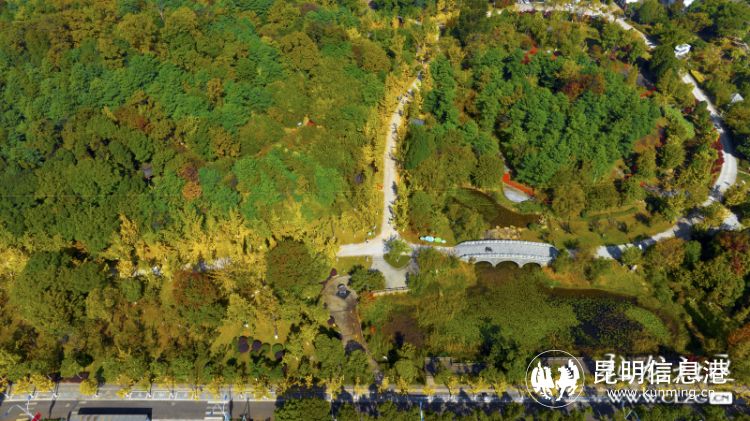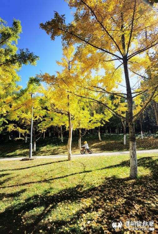 春融公園位于昆明市級(jí)行政中心辦公區(qū)北部,馬路邊、公園內(nèi)均有成片的銀杏林,目前大半已黃,腳踏滿地落葉,可以在林間漫步留影。