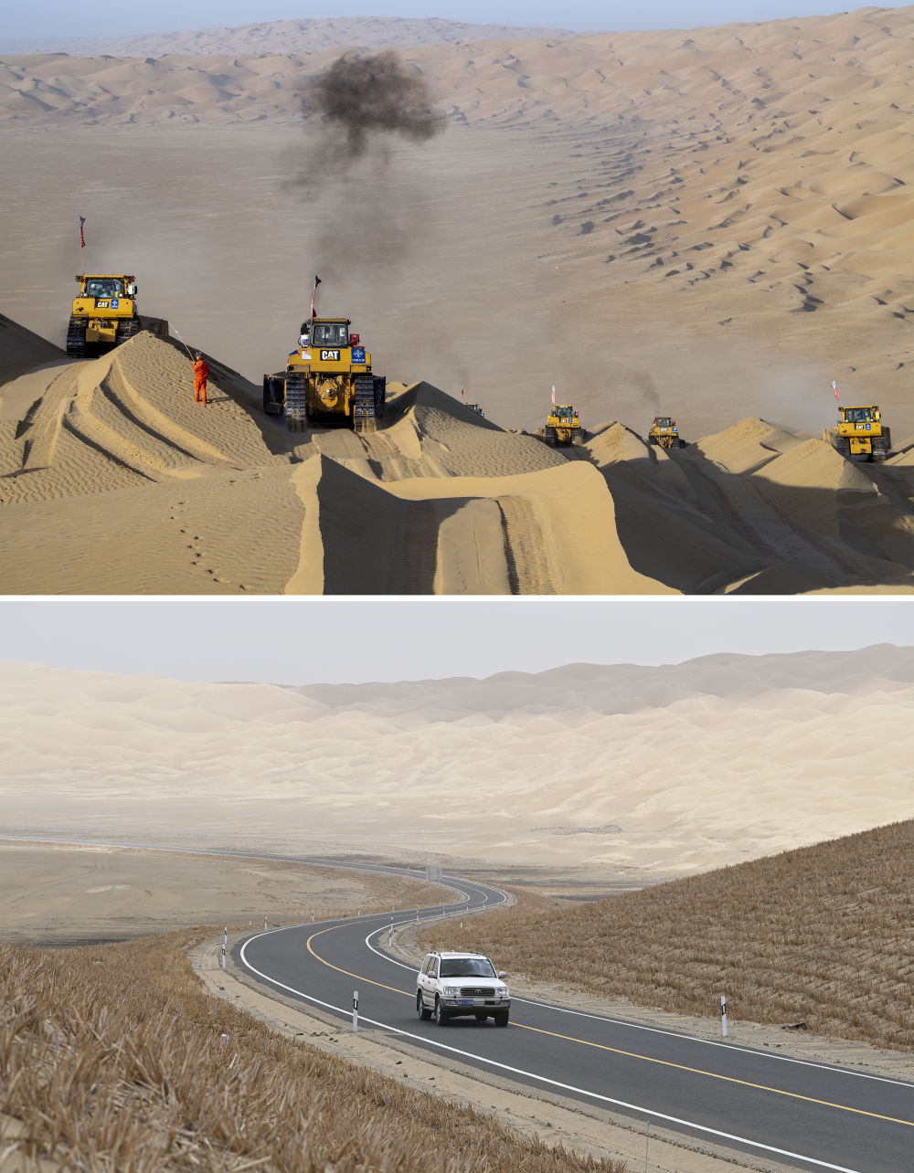 ↑ 上圖為2020年5月16日拍攝的尉犁至且末沙漠公路施工現(xiàn)場(新華社記者胡虎虎攝);下圖為2022年6月25日在尉犁至且末沙漠公路同一路段拍攝的工作車輛在路面行駛(新華社記者李響攝)。