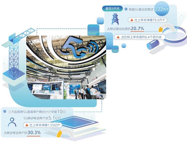5G商用已滿3年。工業(yè)和信息化部日前公布的數(shù)據(jù)顯示,截至9月末,我國5G基站總數(shù)達222萬個,比上年末凈增79.5萬個,占移動基站總數(shù)的20.7%,占比較上年末提升6.4個百分點。同時,我國三大運營商5G套餐用戶數(shù)合計已突破10億;5G移動電話用戶達5.1億戶,比上年末凈增1.55億戶,占移動電話用戶的30.3%。