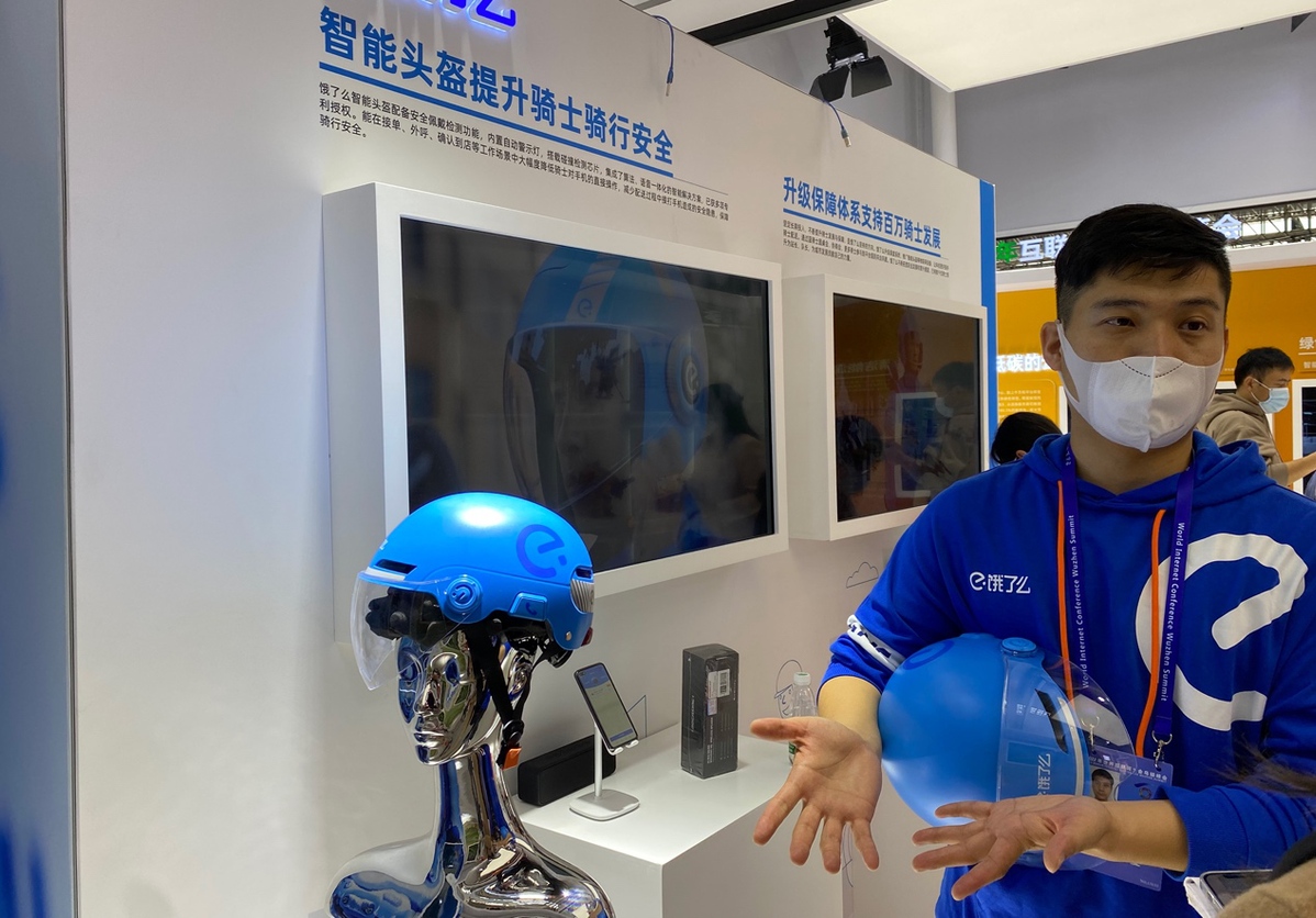 外賣騎手的安全問題一直備受關注。在博覽會上,記者看到一款集合了手機和頭盔功能的智能頭盔。它利用物聯網、大數據、人工智能等技術,在設計中加入傳感器和硬件模組,一方面可以幫助識別騎手的安全狀態(tài),另一方面通過增加語音操作,減少對手機的直接操作,保障了騎手人身安全。