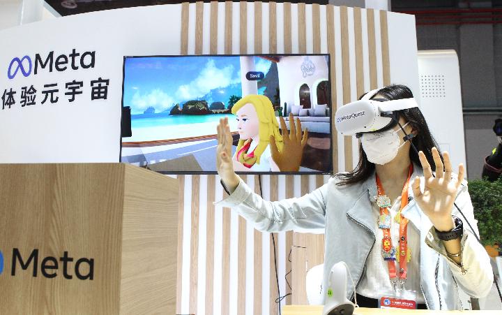 11月7日,在第五屆進(jìn)博會技術(shù)裝備展區(qū)的人工智能專區(qū),一名媒體工作人員借助VR頭戴設(shè)備體驗虛擬工作空間“元宇宙”交互應(yīng)用。新華社記者 侯俊 攝