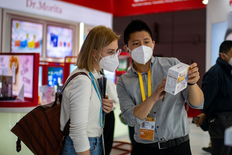 11月8日,在進博會消費品展區(qū),來自俄羅斯的經銷商正在了解益生菌產品。人民網記者 翁奇羽攝