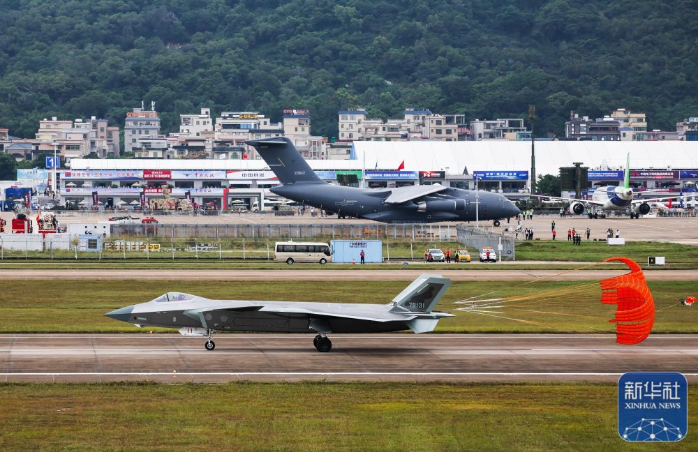 在第十四屆中國航展上,殲-20(前)降落珠海機(jī)場后從運(yùn)油-20前滑過(11月8日攝)。新華社記者 劉大偉 攝