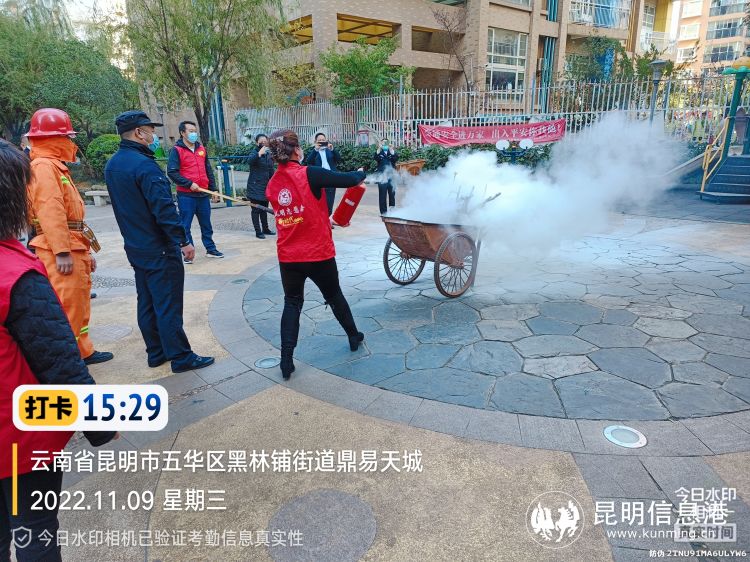 昆明信息港訊 為提高轄區(qū)消防安全意識,增強(qiáng)轄區(qū)居民與物業(yè)工作人員對消防設(shè)備的使用及自救常識,牢固樹立“愛惜自己家園 驅(qū)逐火災(zāi)隱患”的理念,提高消防安全綜合素質(zhì),營造穩(wěn)定良好的消防安全環(huán)境,11月9日,國際花園社區(qū)聯(lián)合鼎易天城物業(yè)、科醫(yī)路派出所在鼎易天城小區(qū)開展了消防演練活動。