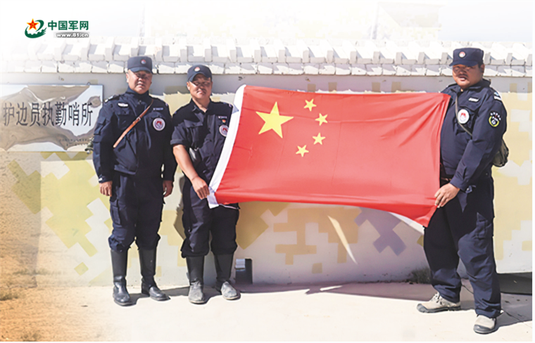 護(hù)邊員在護(hù)邊員執(zhí)勤哨所前展示國(guó)旗。王奮偉攝