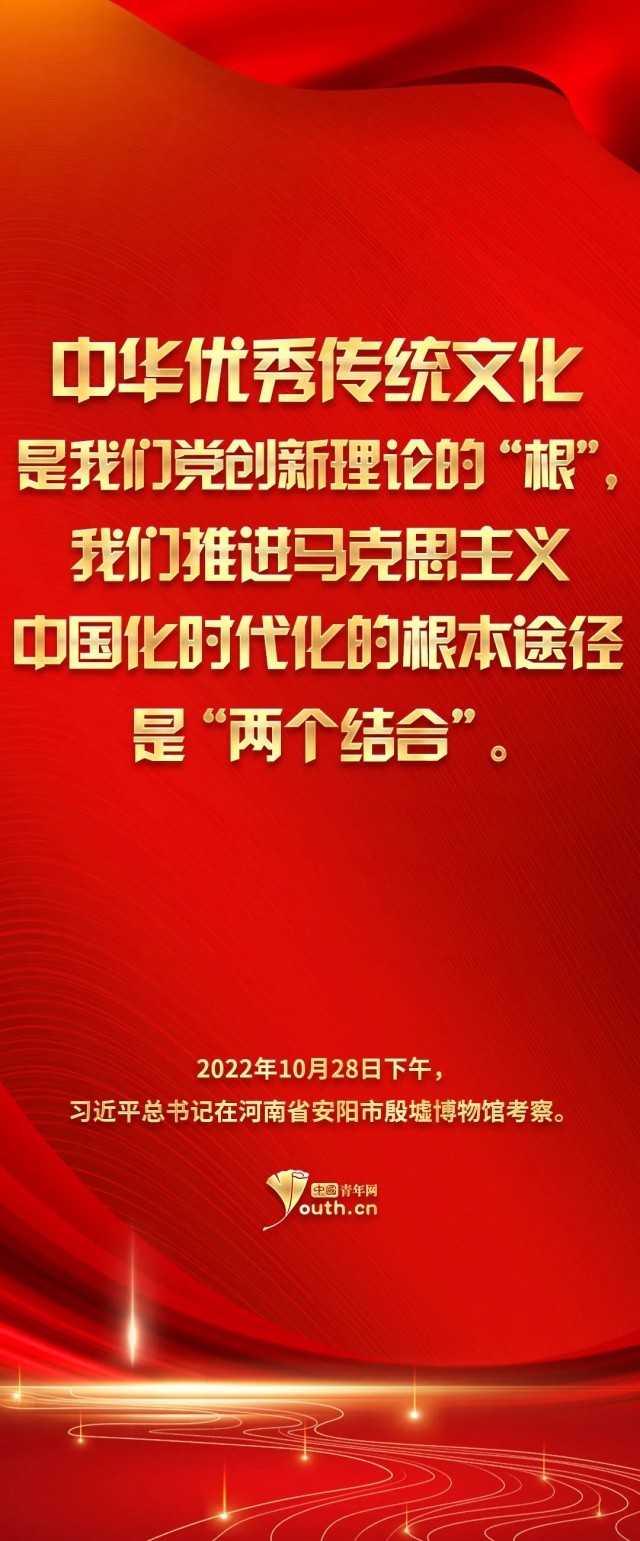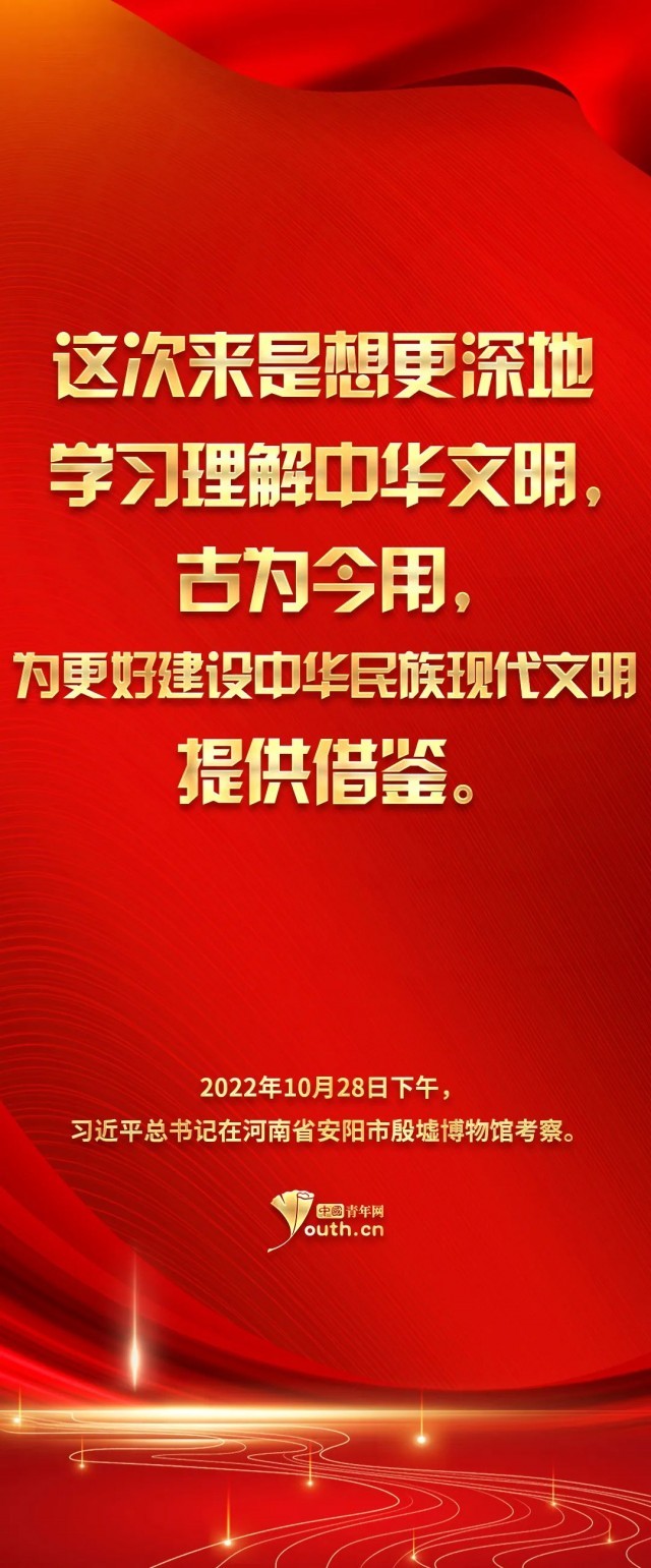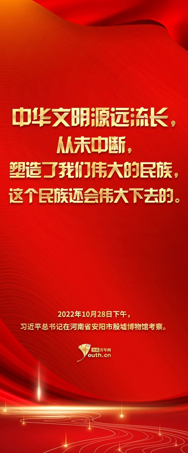 參天之木,必有其根;懷山之水,必有其源。習總書記的這次殷墟考察之行,讓我們將目光再次聚焦到中華民族的傳統(tǒng)文化之上。青山百代,仍蔭后人。正如習總書記指出的——中華優(yōu)秀傳統(tǒng)文化是我們黨創(chuàng)新理論的“根”,我們推進馬克思主義中國化時代化的根本途徑是“兩個結(jié)合”——民族要獨立自強,國家欲穩(wěn)步發(fā)展,文化是來自深處的支撐。作為當代青年,我們理應響應時代號召,跟隨習近平總書記的腳步,去深入了解學習中華文明,兼顧歷史之沉淀與時代之新意,在向世界發(fā)揚中華氣象的同時,也邀得當年之明月照徹今人。
