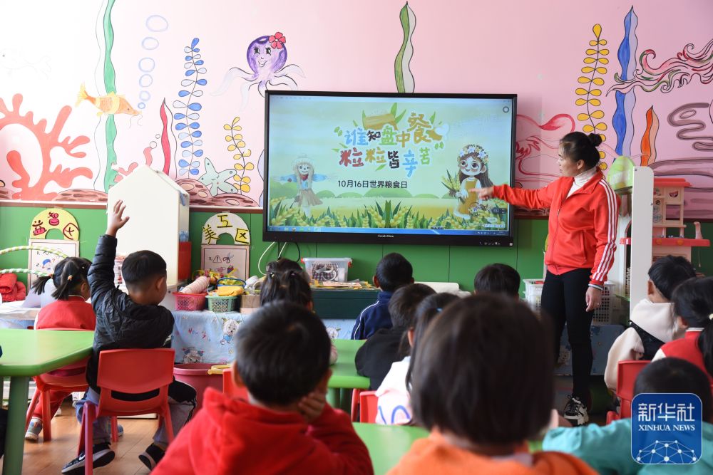 11月10日,云南省麗江師范高等專科學(xué)校附屬新苗幼兒園的老師向孩子介紹珍惜糧食的知識。新華社發(fā)(趙慶祖攝)