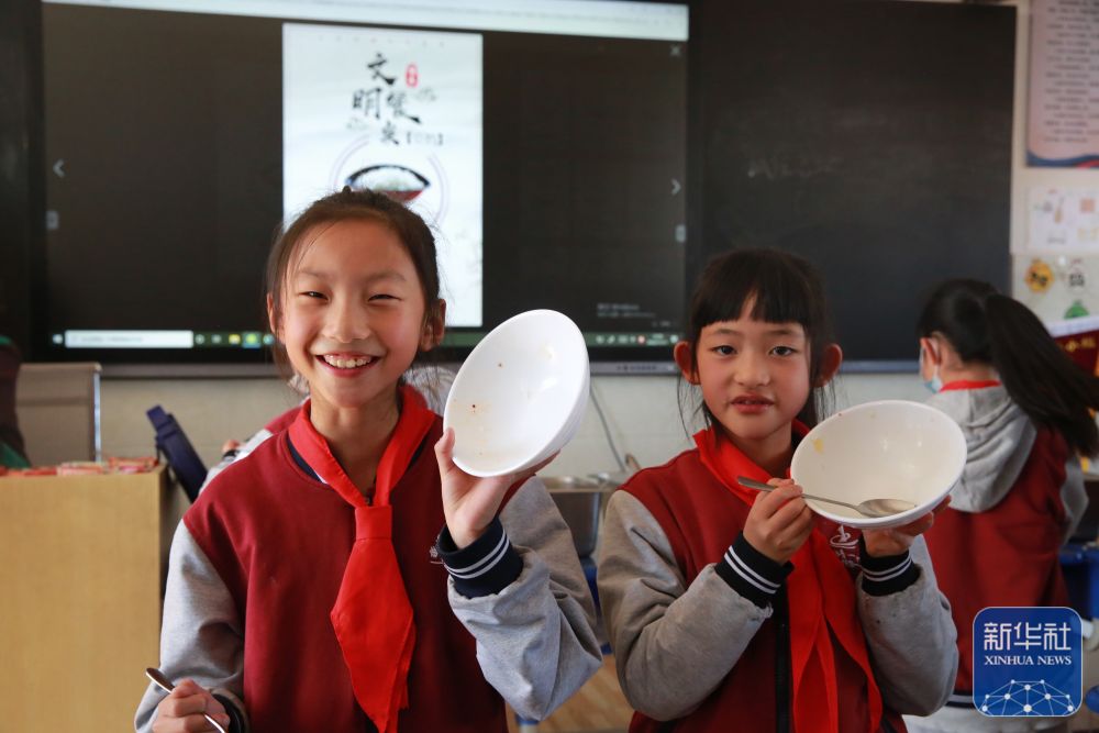 11月11日,在云南省曲靖市第一小學(xué)四年級6班教室,小學(xué)生在展示吃干凈的飯碗。新華社發(fā)(段娟/攝)