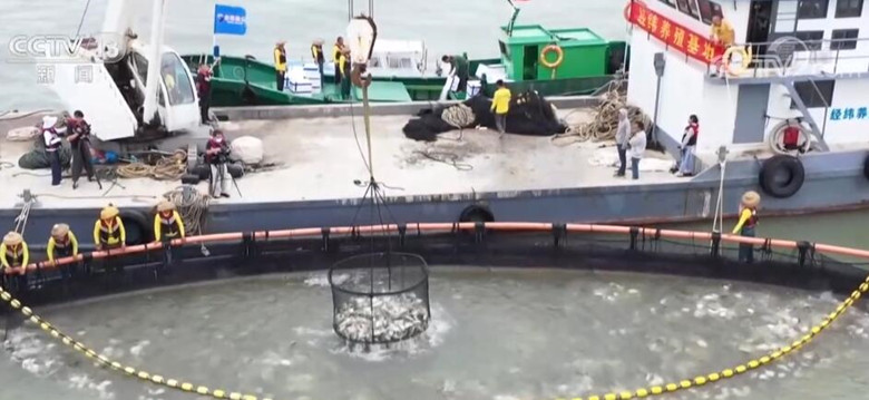 在廣東湛江的一處海上養(yǎng)殖基地,隨著船上的吊臂緩緩升起,魚圈內(nèi)的大網(wǎng)慢慢收緊,大量的金鯧魚在水面跳動。