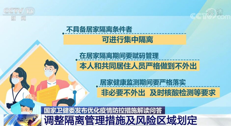 央視網(wǎng)消息:國務(wù)院聯(lián)防聯(lián)控機(jī)制11日發(fā)布關(guān)于進(jìn)一步優(yōu)化新冠肺炎疫情防控措施、科學(xué)精準(zhǔn)做好防控工作的通知,通知明確了進(jìn)一步優(yōu)化防控工作的二十條措施。今天(11月13日),國家衛(wèi)生健康委發(fā)布《關(guān)于進(jìn)一步優(yōu)化新冠肺炎疫情防控措施 科學(xué)精準(zhǔn)做好防控工作的通知》解讀問答,對《通知》出臺的背景、優(yōu)化和調(diào)整的具體內(nèi)容等進(jìn)行了詳細(xì)解讀。先來看看對隔離管理及風(fēng)險區(qū)域劃定方面的調(diào)整。