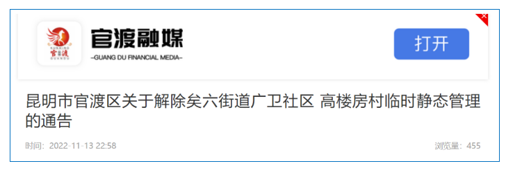 昆明市官渡區(qū)關于解除矣六街道廣衛(wèi)社區(qū) 高樓房村臨時靜態(tài)管理的通告
