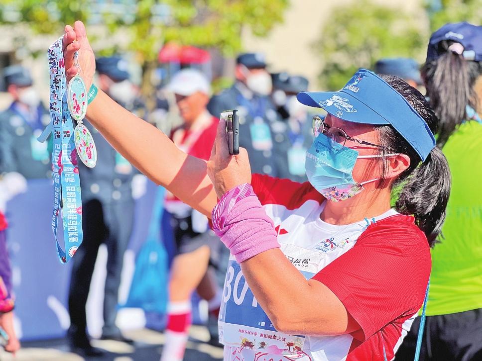 選手高舉完賽獎(jiǎng)牌拍照留念