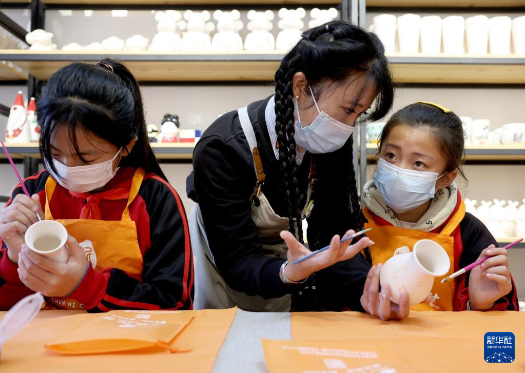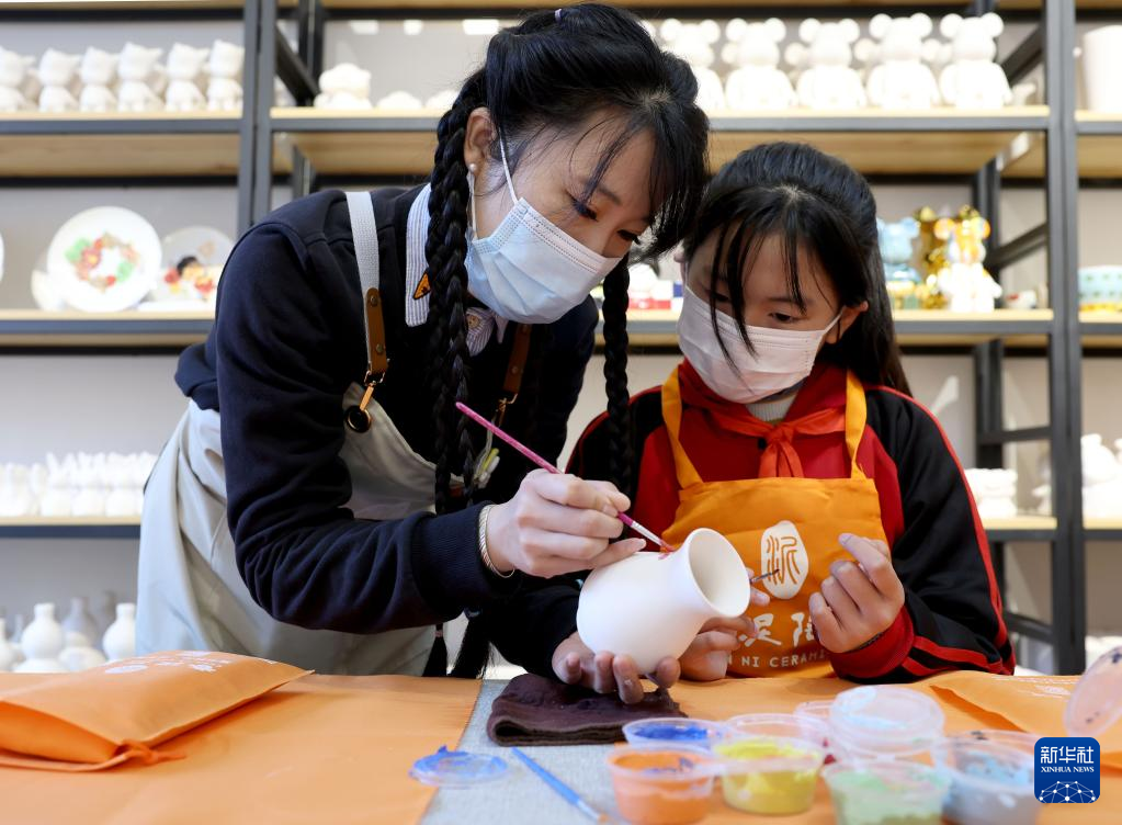 11月11日,江蘇省徐州市漢王鎮(zhèn)紫山村春泥陶藝的老師(左)在陶藝教室向?qū)W生講解彩陶繪陶的有關(guān)知識。