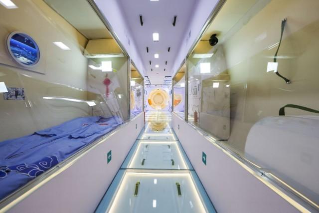 這是11月9日拍攝的中國空間站組合體展示艙內(nèi)呈現(xiàn)的天和核心艙航天員睡眠區(qū)和衛(wèi)生區(qū)。