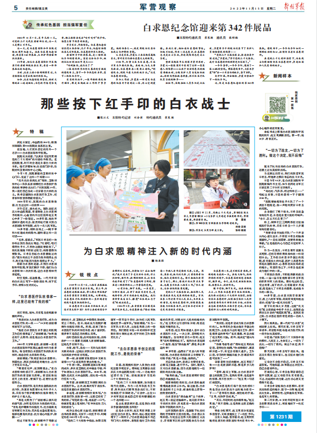 眼中有路,腳下生風。站在新的起點上,工作在白求恩親手創(chuàng)立的醫(yī)院,我們要以黨的二十大精神為指引,接續(xù)傳承白求恩精神,切實把官兵和人民群眾的需要作為不懈努力的方向,以昂揚姿態(tài)投身現(xiàn)代化衛(wèi)勤力量建設(shè),為白求恩精神注入新的時代內(nèi)涵。(解放軍報特約通訊員 崔寒凝 通訊員 張彬楠)