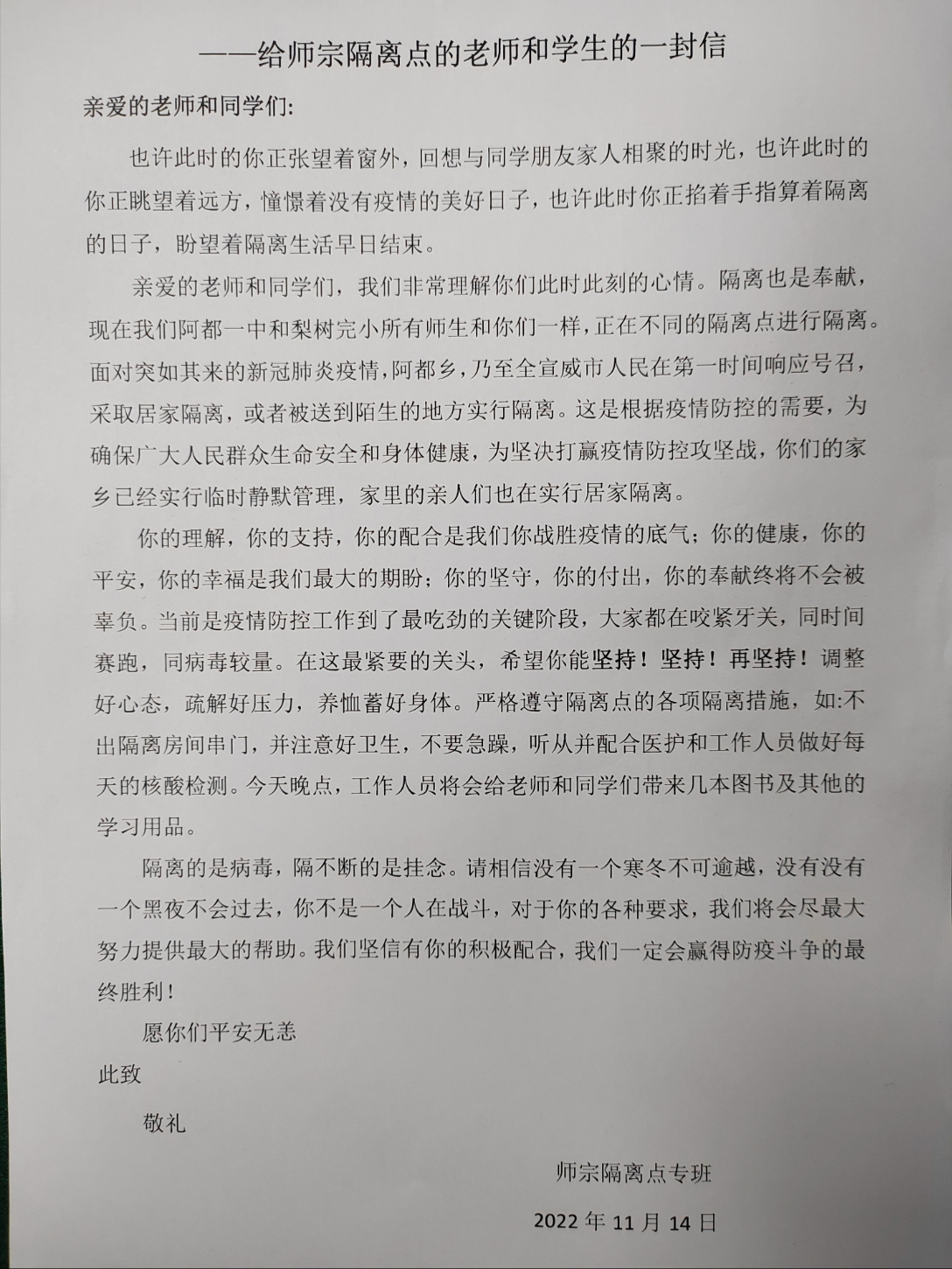 寫一封“溫情”的信。隔人不隔心,守護一直在。11月15日,143封由“兄弟”市(縣)派駐陪護工作人員及紅磚廠集中隔離點專班工作人員手寫的書信,送到了每位隔離學生的手中?!靶闹杏袗?,春暖花開。”“我們心手相牽,沒有跨不過去的坎,加油!”用文字彰顯溫度,用語言表達力量,在保證食宿條件,滿足生活必要需求前提下,隔離組采取寫信等暖心舉措,不斷加強對學生集中隔離期間的關心關愛和人文關懷。