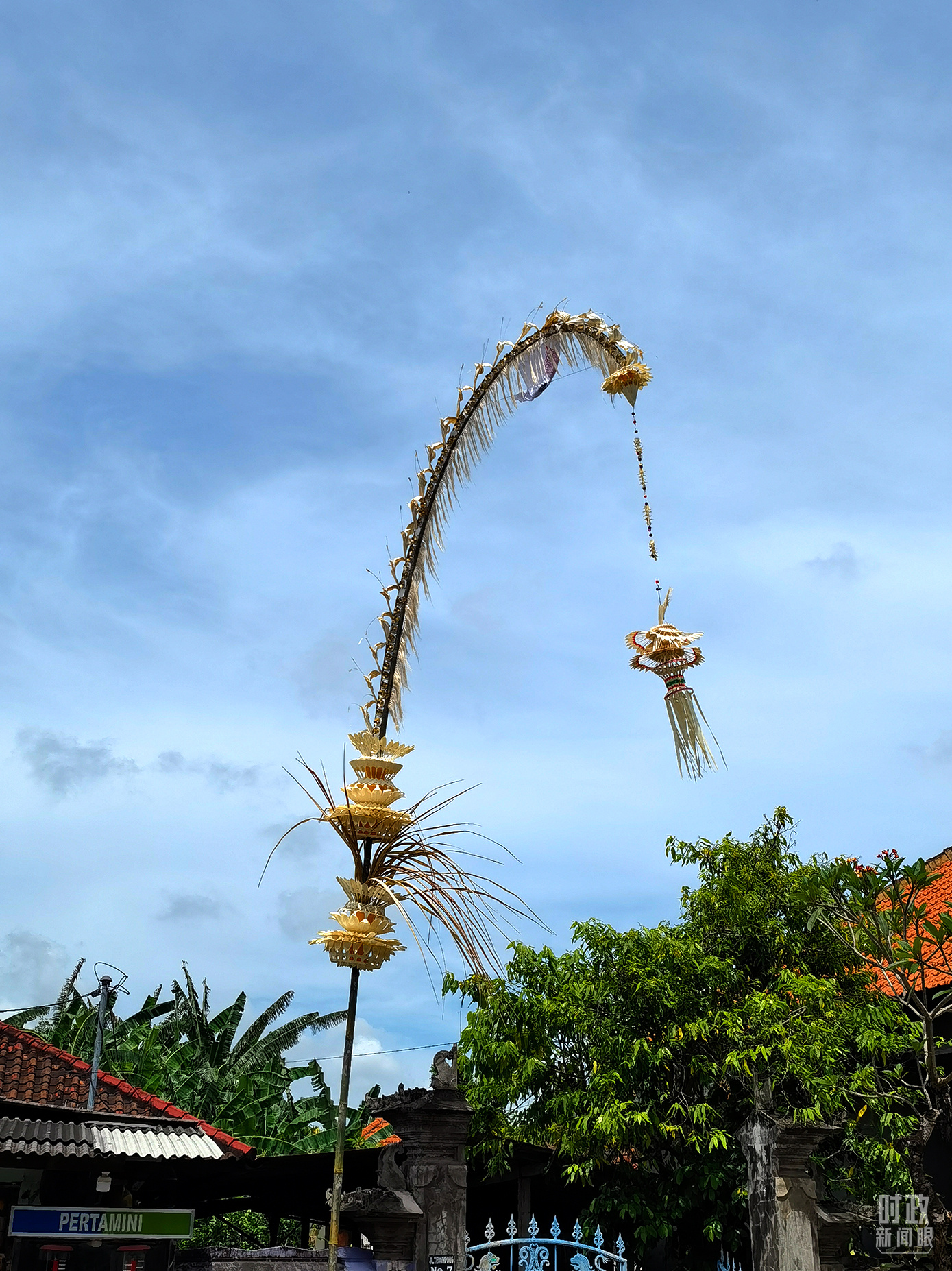 △每逢重大節(jié)日,巴厘島就會裝飾起蓬葭。它由椰子葉和鮮花制作而成,表達巴厘島人對萬物之神的祝福和感激。(總臺央視記者韓銳拍攝)