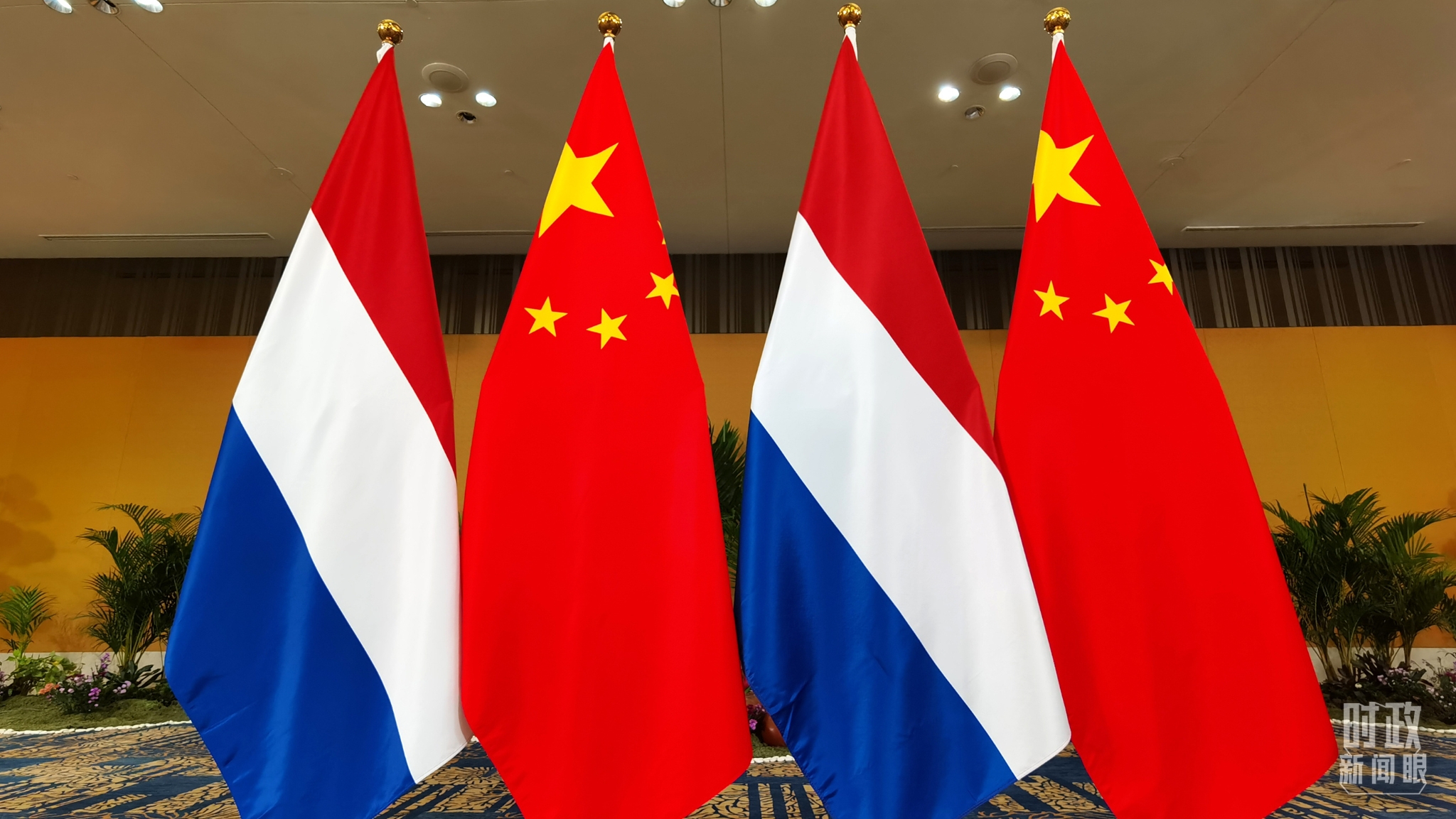 △會見現(xiàn)場的中國和荷蘭兩國國旗。(總臺央視記者曹亞星拍攝)