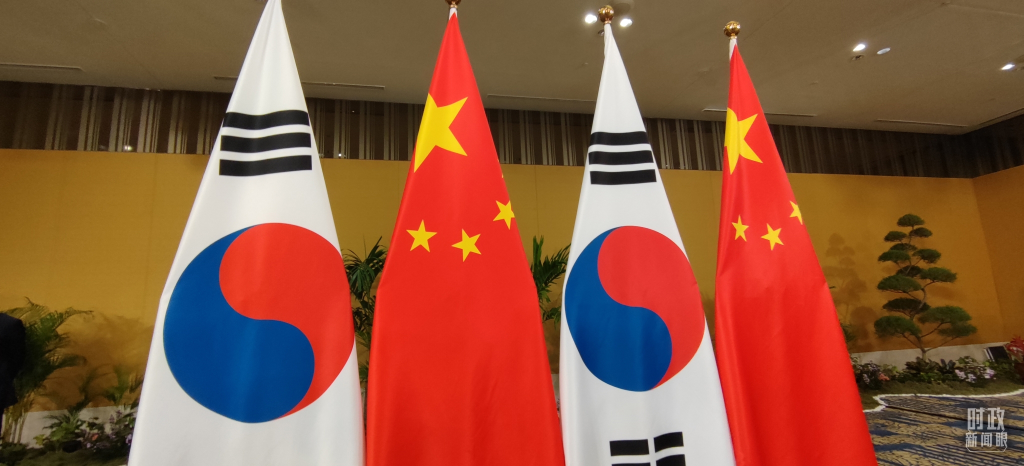 △會見現(xiàn)場的中國和韓國兩國國旗。(總臺央視記者耿小龍拍攝)