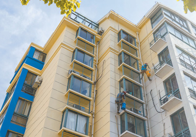 江蘇宿遷市泗陽縣海天康庭名苑小區(qū)內(nèi),工人們正對(duì)小區(qū)外墻進(jìn)行粉刷。裴 成攝(人民視覺)