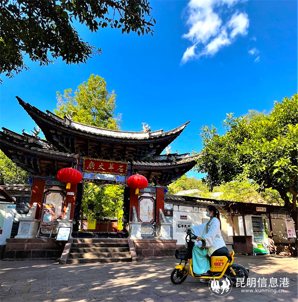 “強國電單車”投放大姚縣石羊鎮(zhèn)后,當?shù)鼐用耱T車打卡石羊文廟。