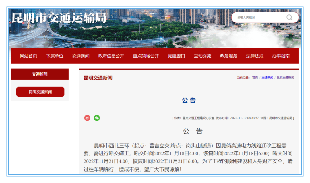 因昆倘高速電力線路遷改工程需要,昆明市西北三環(huán)(起點:普吉立交 終點:崗頭山隧道)需進行斷交施工。
