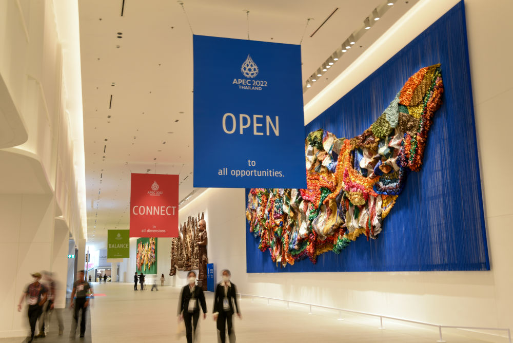 曼谷商業(yè)區(qū)的詩麗吉王后國家會議中心是亞太經(jīng)合組織第二十九次領(lǐng)導(dǎo)人非正式會議主會場,藍(lán)、紅、綠三色標(biāo)語格外醒目,組成這次會議的主題“開放、聯(lián)通、平衡”。