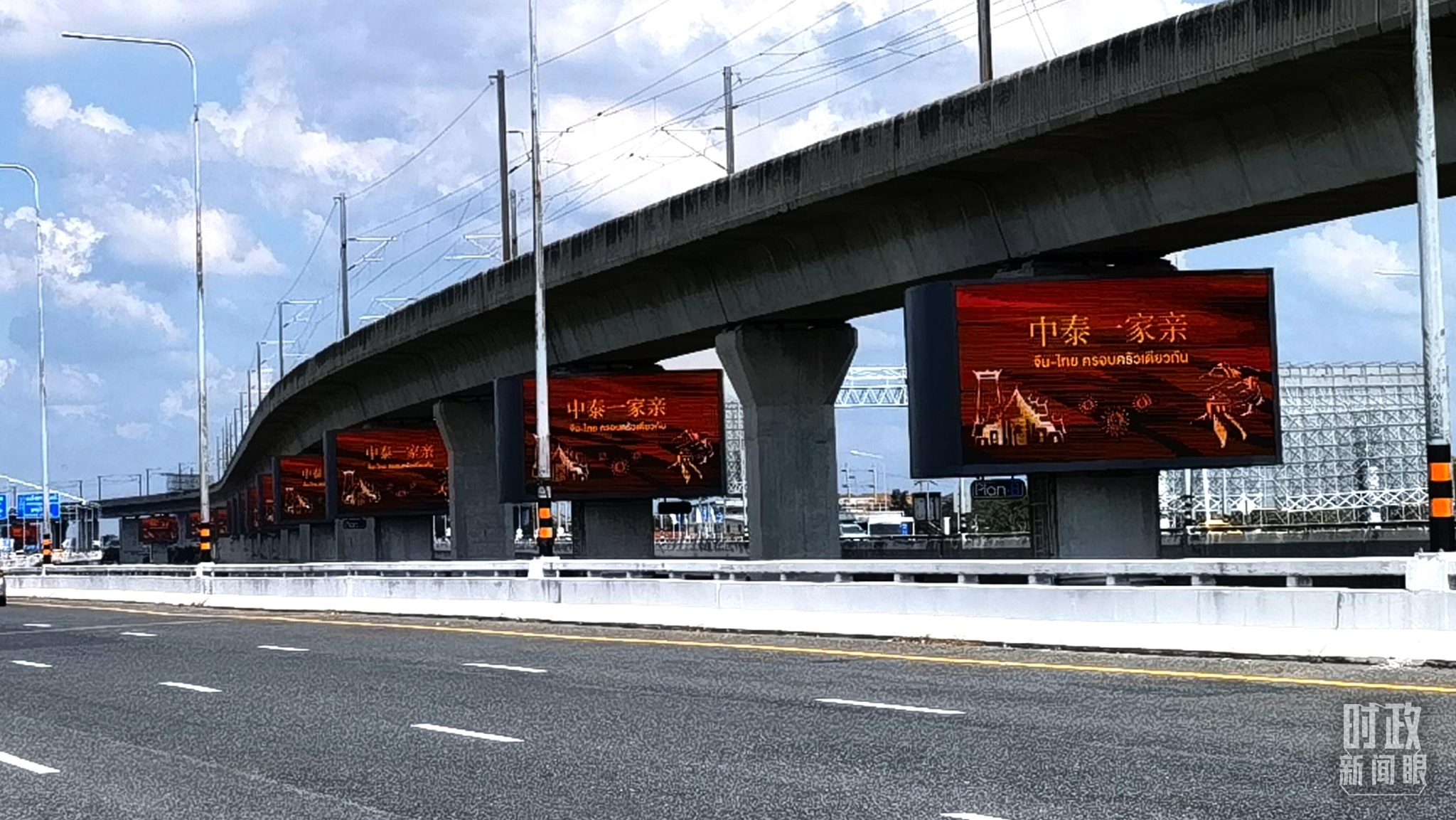 △曼谷街道,巨幅電子屏用中泰文字寫著“中泰一家親”。(總臺央視記者馬超拍攝)