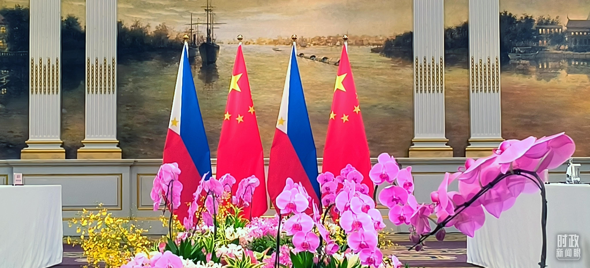 △會談現(xiàn)場的中菲兩國國旗。(總臺央視記者范凱拍攝)