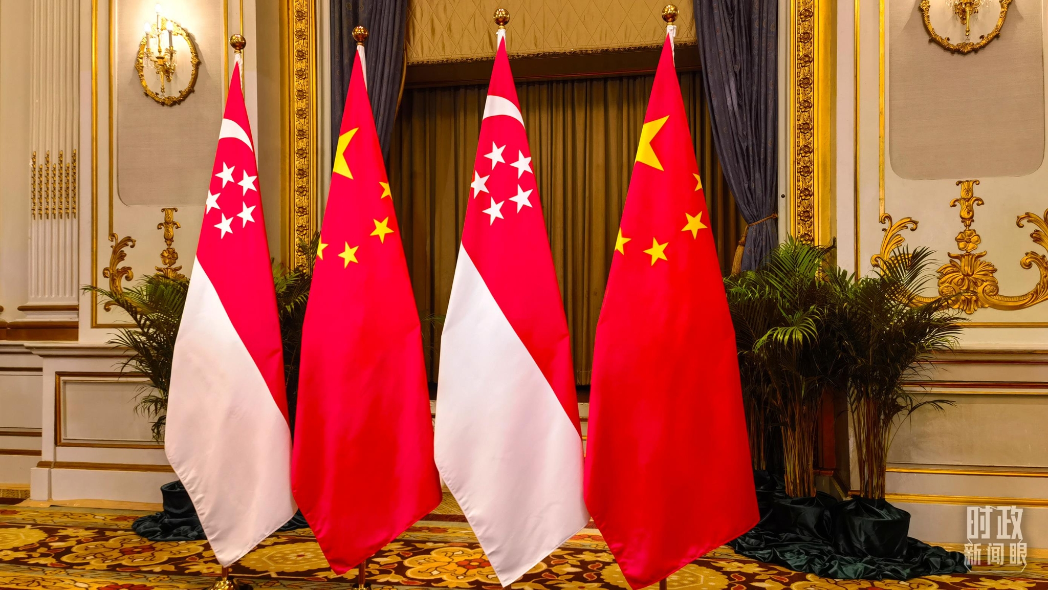 △會見現(xiàn)場的中新兩國國旗。(總臺國廣記者吳倩拍攝)