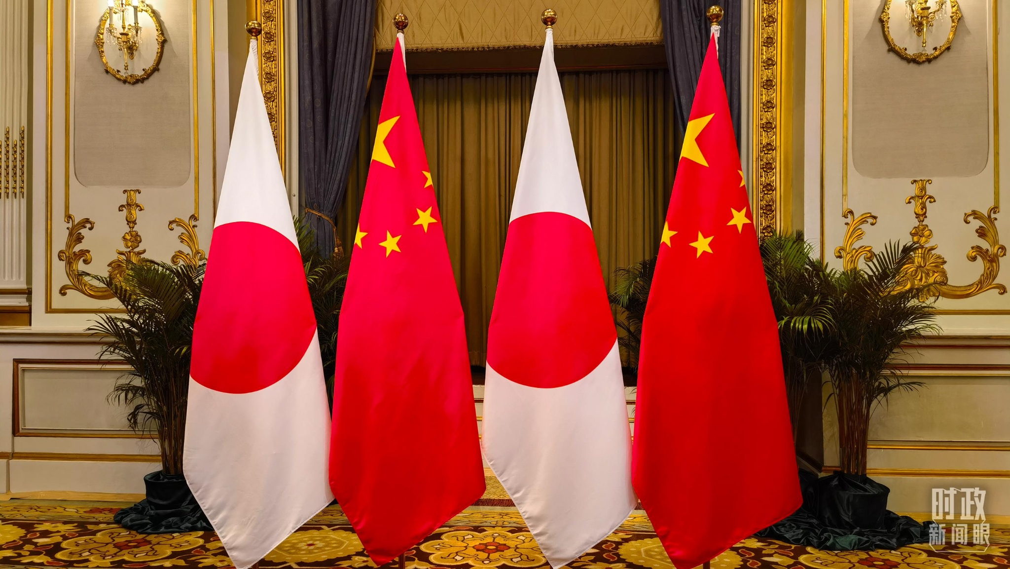 △會見現(xiàn)場的中日兩國國旗。(總臺國廣記者吳倩拍攝)