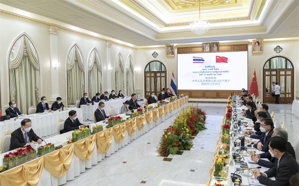 習近平指出,雙方要像走親戚一樣常來往、多走動,在涉及彼此核心利益和重大關(guān)切問題上繼續(xù)相互堅定支持。雙方要落實好未來5年《中泰戰(zhàn)略性合作共同行動計劃》,統(tǒng)籌推動各領(lǐng)域合作取得更多成果。要有效對接各自發(fā)展戰(zhàn)略,推動高質(zhì)量共建“一帶一路”不斷取得新成效。雙方要加強投資、貿(mào)易、旅游、基礎設施、產(chǎn)業(yè)園等傳統(tǒng)領(lǐng)域合作,同時不斷培育新增長點,推動數(shù)字經(jīng)濟、新能源汽車、科技創(chuàng)新等新領(lǐng)域合作取得積極進展。要加快中老泰三方鐵路合作,積極推進“中老泰聯(lián)通發(fā)展構(gòu)想”,重點加強基礎設施“硬聯(lián)通”,做好物流通關(guān)“軟聯(lián)通”,擴大泰國優(yōu)質(zhì)農(nóng)副產(chǎn)品輸華。中方愿同包括泰國在內(nèi)的各方一道,高質(zhì)量實施《區(qū)域全面經(jīng)濟伙伴關(guān)系協(xié)定》,讓這一全球最大自貿(mào)區(qū)安排釋放更大紅利。加大打擊跨境犯罪,深化追逃追贓合作。加強教育、醫(yī)療、扶貧等民生領(lǐng)域合作,通過多種方式交流減貧發(fā)展經(jīng)驗,推動兩國扶貧合作走深走實,辦成、辦好一批貼近群眾、服務基層的實事。要加強青年交流,使兩國人民心更近、情更深,豐富中泰命運共同體的人文內(nèi)涵。