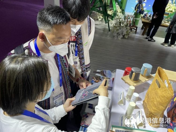 (現(xiàn)場工作人員介紹瀘西系列文創(chuàng)展品—彝繡筆記本)