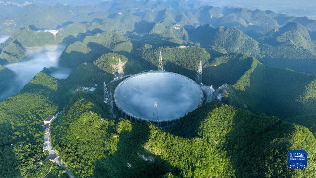 晨曦中的“中國天眼”全景(無人機(jī)照片,2022年7月25日維護(hù)保養(yǎng)期間拍攝)。新華社記者 歐東衢 攝